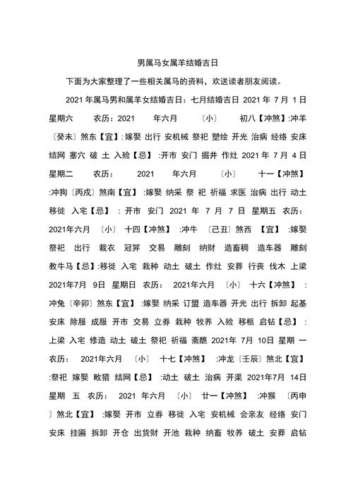 结婚是人生中的重大时刻,每个人都希望在这个特殊的日子里,能迎来吉祥如意的美好未来。对于属羊的人来说,选择一个合适的结婚吉日不仅能够带来好运,更能让婚姻生活更加幸福美满。而在众多的吉日选择中,六月尤为受到关注。那么,属羊人士在六月结婚的吉日应该如何挑选呢?