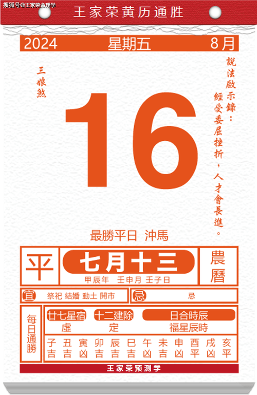 要判断八月16号是否为黄道吉日,我们首先需要分析该日的天干地支配置。2024年的八月16号对应的天干地支为“甲辰日”。在五行中,“甲”属木,“辰”属土。木生土,木土相生,这种配置通常被认为是比较和谐的,有助于促进运势。仅凭这一点还不足以完全确定该日的吉凶。