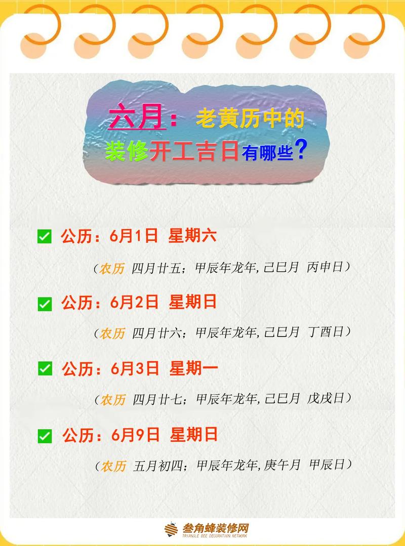 根据中国传统的黄历,2024年6月份有几个特别适合装修的吉日。以下是几天吉日的详细信息,供您参考: