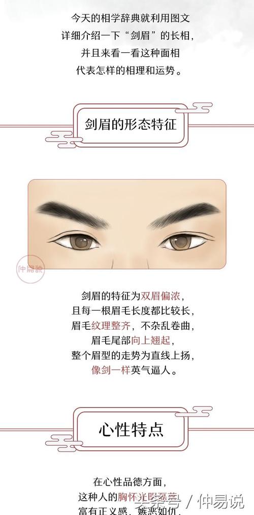 眉若山林秀且长,威权志识辅君王,纵贫不日成清贵,子孙行行显寿康。拥有剑眉的人,眉毛像山林般清秀、而且细长。剑眉的人注定会有权势有学识,多是国家栋梁。这样的人即使早期贫贱,他日也会富贵,而且子孙满堂身体健康长寿。