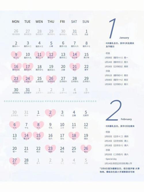在选择婚礼吉日时,还应考虑到宾客的安排和其他生活因素,以确保婚礼当天的顺利进行。通过综合考虑这些因素,您可以为您的婚礼挑选一个最为合适的吉日,让您的大喜之日充满美好与吉祥。