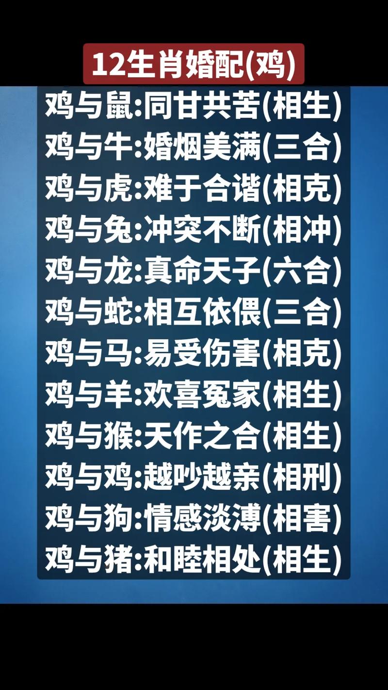 以上婚配宜忌仅供参考,具体婚姻幸福与否,还取决于双方性格、三观和价值观是否契合。属鸡男士在择偶时,应多方面考察,选择真正适合自己的伴侣。