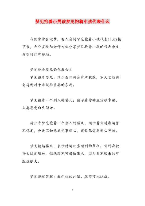 梦见抱男孩子,主荣华富贵。男孩子象征着力量和财富,预示着梦者事业有成,财运亨通。对于已婚女性,梦见抱男孩子,还可能预示着生子之意。