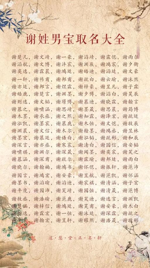 为谢氏龙宝宝起名,是一场意义非凡的文化之旅。遵循姓名学原则,融入传统文化内涵,避开禁忌,结合宝宝自身特点,方能为其定制一个吉祥如意、寓意深远的名字。