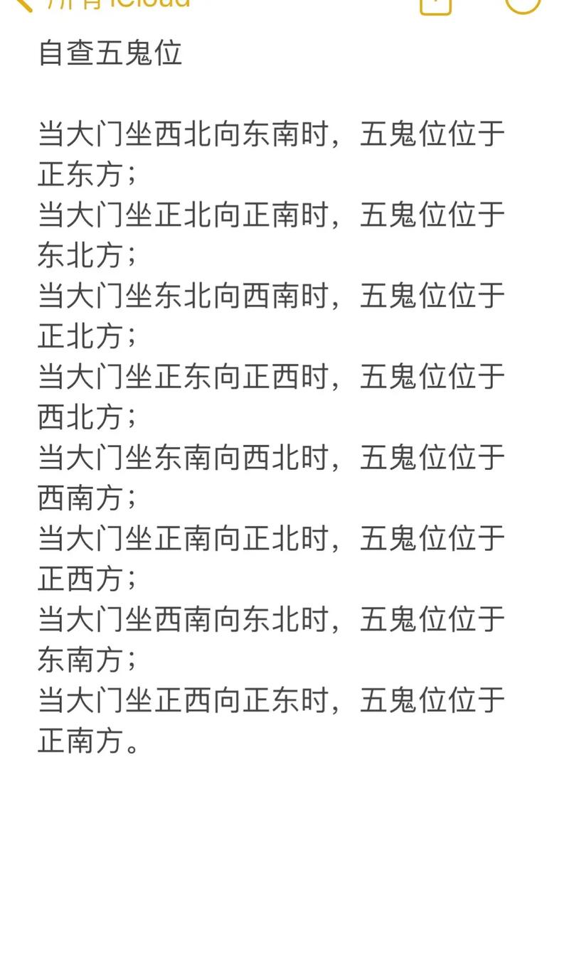 确定五鬼方的方法有多种,一种是结合八字命理,根据主人的出生时辰确定对应的方位;另一种是依据房屋的坐向,通常位于房屋的绝命方或五黄煞方。