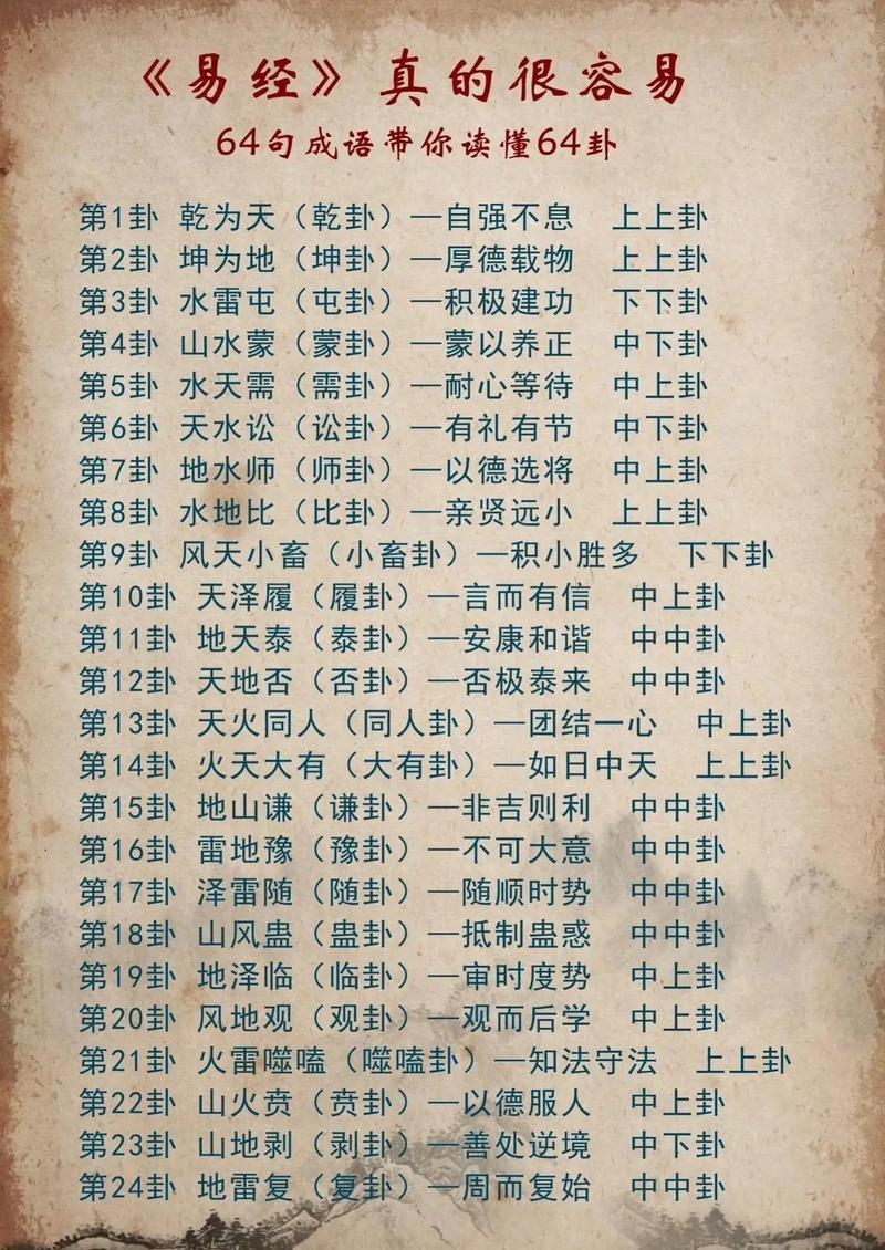 在现代社会中,很多人开始将易经的智慧运用于日常生活,尤其是在决策和风险管理方面。通过深入了解各个卦象的含义,我们可以在面临重要选择时,借助易经的指导来判断吉凶,做出更明智的决策。例如,若处于职场困境中,利用周易中的卦象进行占卜,可能会帮助我们识别潜在的机遇或隐患,从而更有效地调整策略。