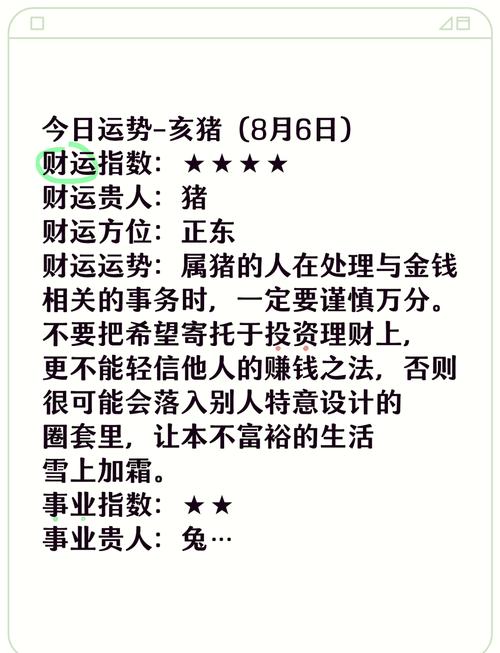 属猪59年出生的朋友们在今天的财运状况中充满了变数与挑战。通过谨慎的理财规划和敏锐的市场观察,你可以在波动的财运中找到属于自己的机会。记住,财富的积累不仅仅依赖于运气,更需要智慧与努力的结合。愿你在今天的财运中,能够识别并抓住每一个宝贵的机会,实现财务上的突破!