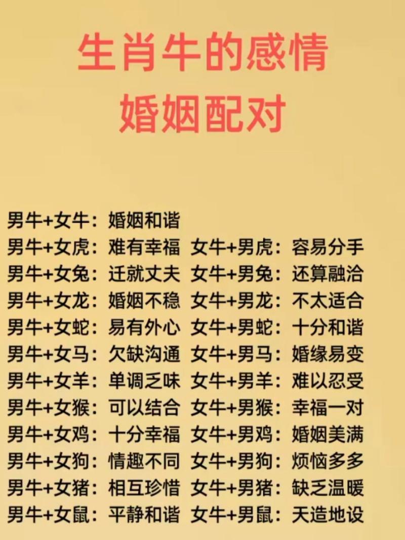 属牛的人在选择婚姻对象时,不仅要考虑生肖配对,还要考虑以下几个方面: