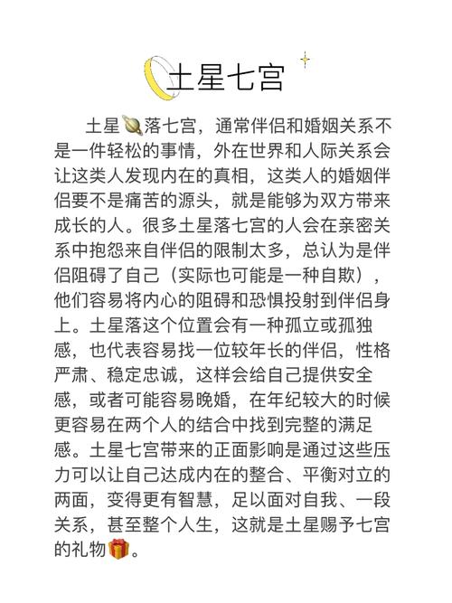在占星学中,土星被视为限制、责任和结构的象征。当土星落入个人星盘的七宫时,这一配置对于婚姻和长期关系的影响极为深远。七宫主管的是伙伴关系和婚姻,土星的加入无疑会为这一领域带来严肃和挑战。那么,土星落入七宫是否意味着婚姻的不幸?还是说,它在某种程度上提供了一种独特的机会?