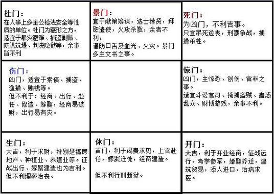 惊门代表惊吓与意外,宜静不宜动,宜守不宜攻,宜缓不宜急。