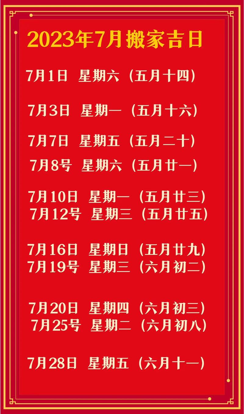 俗话说,“搬家择日,好事多磨”。搬迁的吉日,通常会参考农历中的吉神方位、煞神方位、宜忌等因素。七月份的吉日如下: