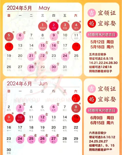 选择婚礼吉日是婚礼筹备中不可忽视的一部分。2024年8月与9月都有多个适合的吉日,为新人们提供了丰富的选择。希望每对新人都能在合适的日子里,共同开启幸福的婚姻生活。在这个充满爱的季节,愿每一场婚礼都如愿以偿,幸福美满。