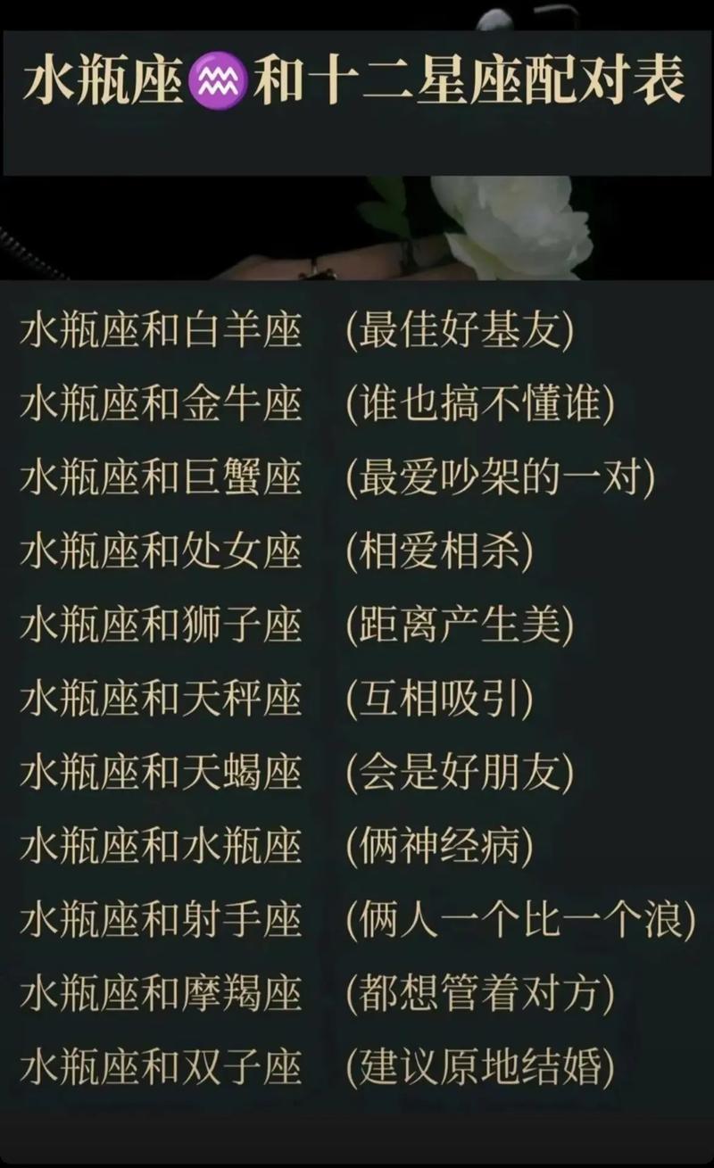 水瓶座与双子座、天秤座、射手座和白羊座的配对都展现出各自的独特魅力和互补性。每一种组合都能带来不同的感情体验和成长机会。了解这些配对,有助于水瓶座的朋友们找到适合自己的伴侣,从而在感情生活中获得更大的满足和幸福。