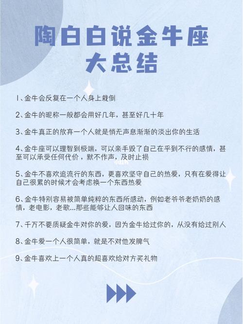 金牛座的爱情特点以稳定和持久为主。这个星座的人通常不喜欢过于激烈的情感波动,他们倾向于追求一种安稳、长久的感情关系。这种稳定的特质使他们在恋爱中表现得非常耐心和包容。陶白白曾指出,金牛座的人对爱情的态度是非常认真的,他们不会轻易进入一段关系,而是一旦决定就会全心投入。