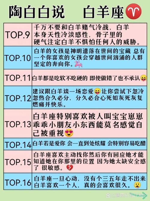 在星座运势的领域中,陶白白以其深刻的洞察力和独特的解读风格深受关注。对于白羊座来说,陶白白对其感情运势的解析,无疑是理解这一充满活力和冲动的星座的关键。本文将从陶白白的视角,全面剖析白羊座在感情方面的运势走向,揭示其潜在的机遇与挑战,帮助你在星座的引导下,更好地掌握白羊座的情感脉络。