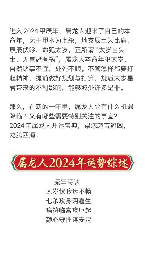 单身属龙女性今年桃花运较弱,难以遇到合适的异性。已婚属龙女性与伴侣的关系受刑太岁的影响,容易发生误会和争吵。需加强沟通,学会相互理解和包容。