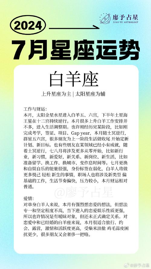 进入七月,白羊座将迎来一个充满活力与挑战的月份。作为火象星座的代表,白羊座以其旺盛的精力和积极的态度着称,但七月的身体运势却将为你带来一些意想不到的变化。本文将详细解析白羊座七月的身体运势,包括健康状况、能量水平以及应对建议,帮助你全面掌握这个月的身体状态,确保你能以最佳状态迎接每一天的挑战。