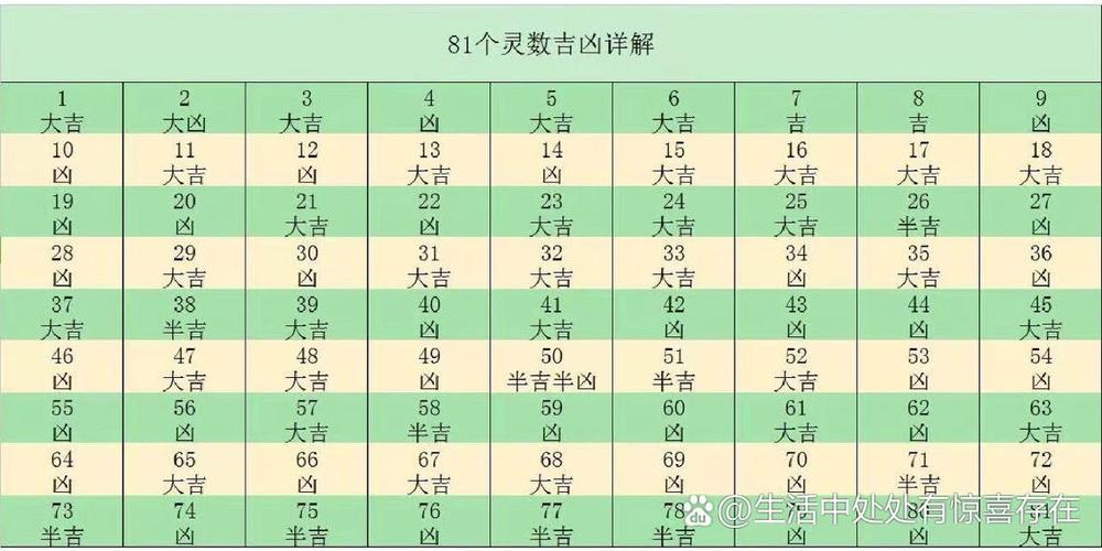 在1至81的范围内,每个数字都有其特定的吉凶寓意。例如,数字1通常象征着开始、领导和独立,它代表了新的机会和希望;数字9则被认为是极数,象征着圆满、和无尽的力量,常常与好运相关。而数字4则在很多文化中被认为是不吉利的,因为它与“死”字的发音相似,这使得它在一些命理学中被视为凶兆。