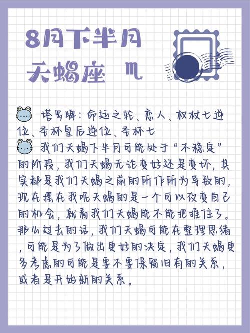 天蝎座,在星座中以神秘、深邃和坚韧着称。作为水象星座的代表之一,你的情感世界常常充满了复杂的纠葛和变幻。进入八月下半月,天蝎座将面临一段特殊的运势波动,既有挑战,也有成长的契机。本文将为你详细解读,帮助你在这段时间里精准把握命运的脉搏,乘风破浪。