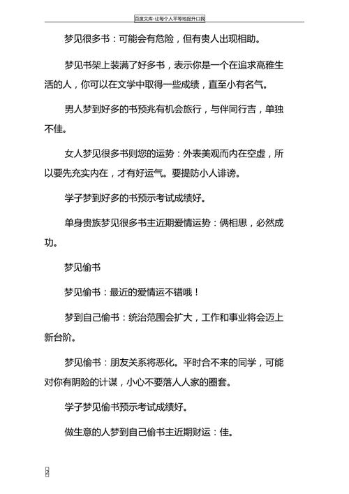 一次,有人梦见自己买书回家。按照周公解梦的解析,这预示着求知若渴,学业有成。梦中的书籍象征着知识和智慧,而回家则代表着知识的归宿和应用。因此,梦境暗示着学习能力强,将获得丰富的知识,并将其运用到生活中。