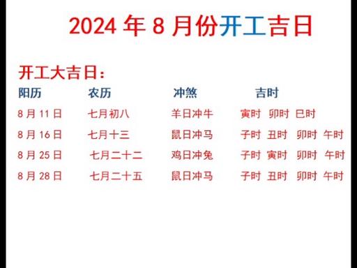 在农历8月中,选择黄道吉日开工可以为企业或个人带来诸多好处。根据传统的黄历学说,这些吉日往往被认为有助于顺利完成工作,避免遇到不必要的障碍。具体到2024年,农历8月的黄道吉日包括: