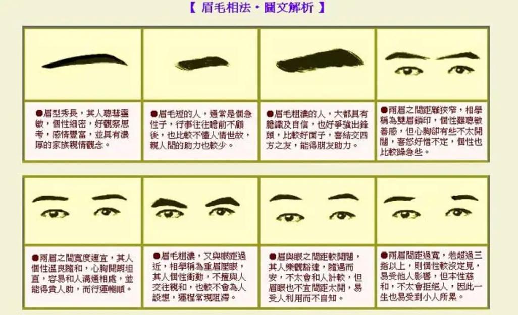 古籍中对眉毛浓宽面相的记载不胜枚举。《麻衣神相》云:“眉浓粗壮,为人豪杰。眉宽阔长,富贵荣昌。”《神相全编》亦载:“眉浓宽厚,主富贵显达。眉粗黑如漆,主寿至八十。”
