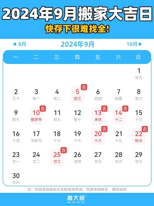根据2024年的黄历,我们为您筛选出了几个适合在九月份搬家的吉日: