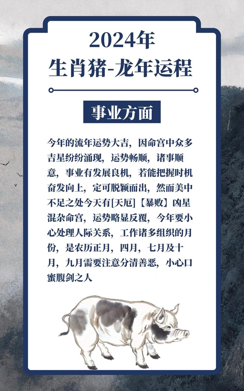 2024年对于属猪的人来说,是一个充满挑战与机遇并存的一年。在事业、财运、感情和健康方面,属猪者都需要保持敏锐的洞察力和积极的态度。通过灵活应对各种变化,勇敢面对生活的挑战,属猪者定能在这一年里开创属于自己的精彩篇章。无论面临什么困难,记住,未来掌握在你自己的手中。