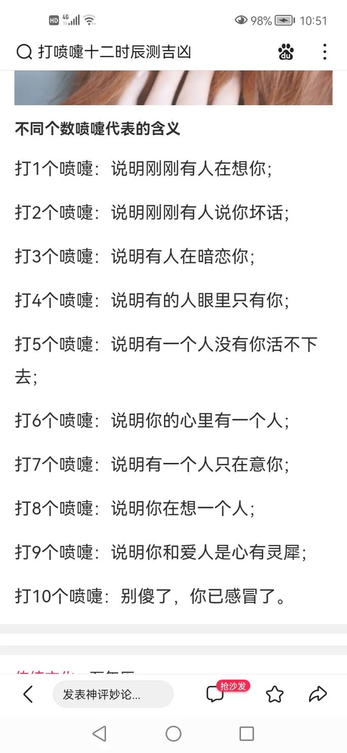 打喷嚏的频率:连续打多个喷嚏,一般视为好兆头;而频繁打喷嚏,则可能预示着身体不适。