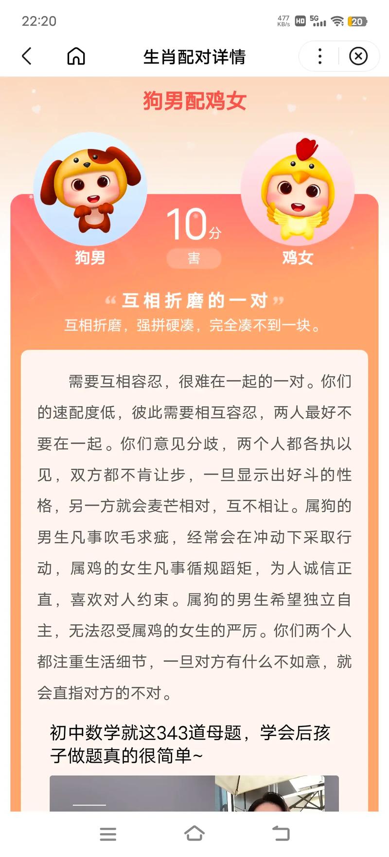 男属狗生性忠厚老实,责任心强,对家庭充满责任感。女属鸡头脑灵活,能言善辩,做事干练。她们的性格互补,相辅相成。狗儿能为家庭提供安定的环境,则能为家庭带来活力和智慧。