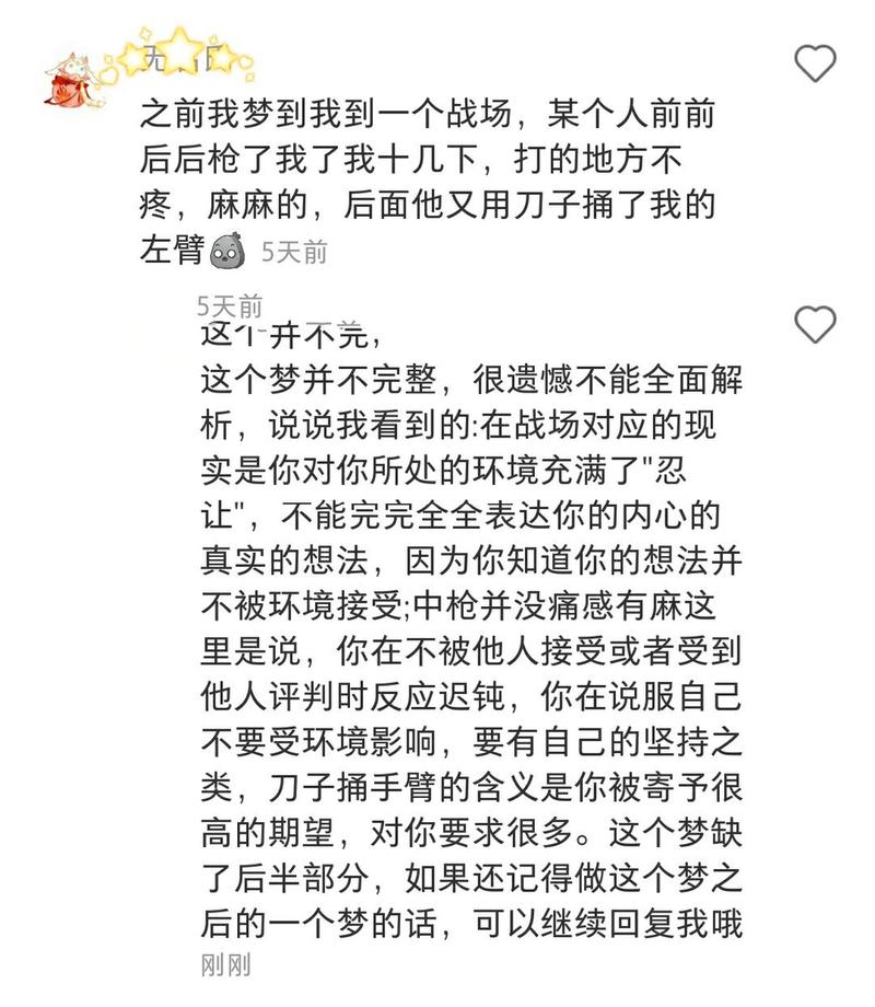 梦见自己参加战争打仗的心理学解析梦境解说:梦中发生的战争代表冲突和争斗,梦见两人决斗则表示你应该更清楚地认识到自己的行为会给别人造成怎样的.影响。这类梦境一般表示你被卷入了一场人为引起的争斗或纠纷之中。