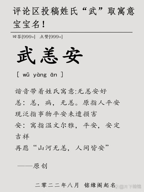 名字的音韵美感至关重要。考虑到“武”字的音节,选择与之搭配和谐的字尤为重要。例如,武姓后跟的字过于生硬,要柔和且有亲和力,以增加名字的韵律感。